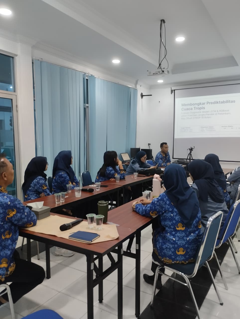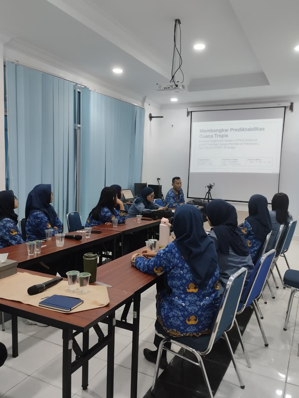 Selanjutnya, Ketua Tim Prakiraan dan Informasi, Bibin Sulianto, memaparkan hasil penelitian berjudul “Membongkar Prediktabilitas Cuaca Tropis”. Penelitian ini mengangkat pendekatan berbasis kecerdasan buatan (Artificial Intelligence/AI) dengan memanfaatkan metode machine learning, khususnya Long Short-Term Memory (LSTM) dan XGBoost. Dalam penjelasannya, Bibin menguraikan bagaimana model-model tersebut digunakan untuk menganalisis pola dan karakteristik cuaca tropis yang cenderung kompleks dan dinamis.